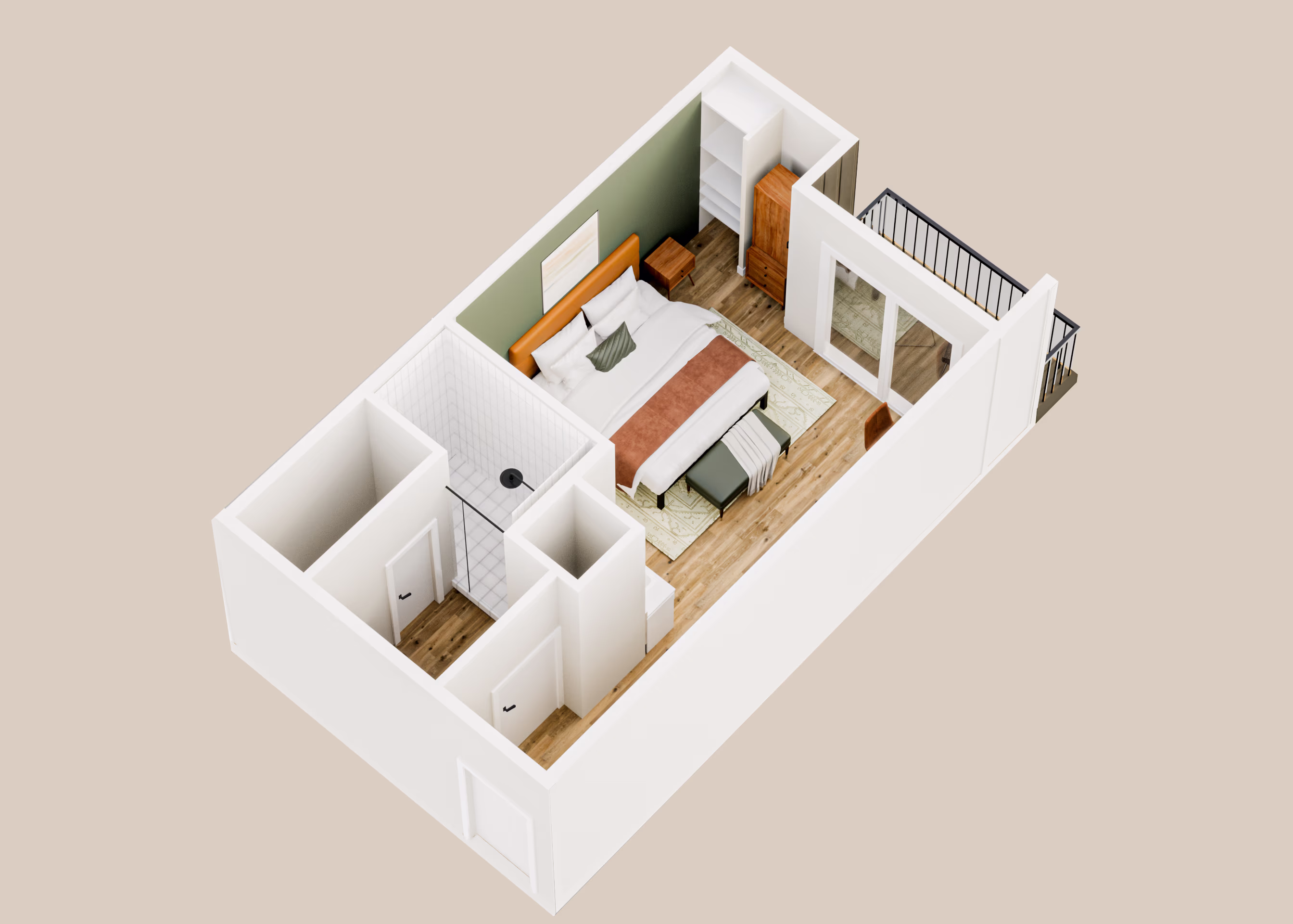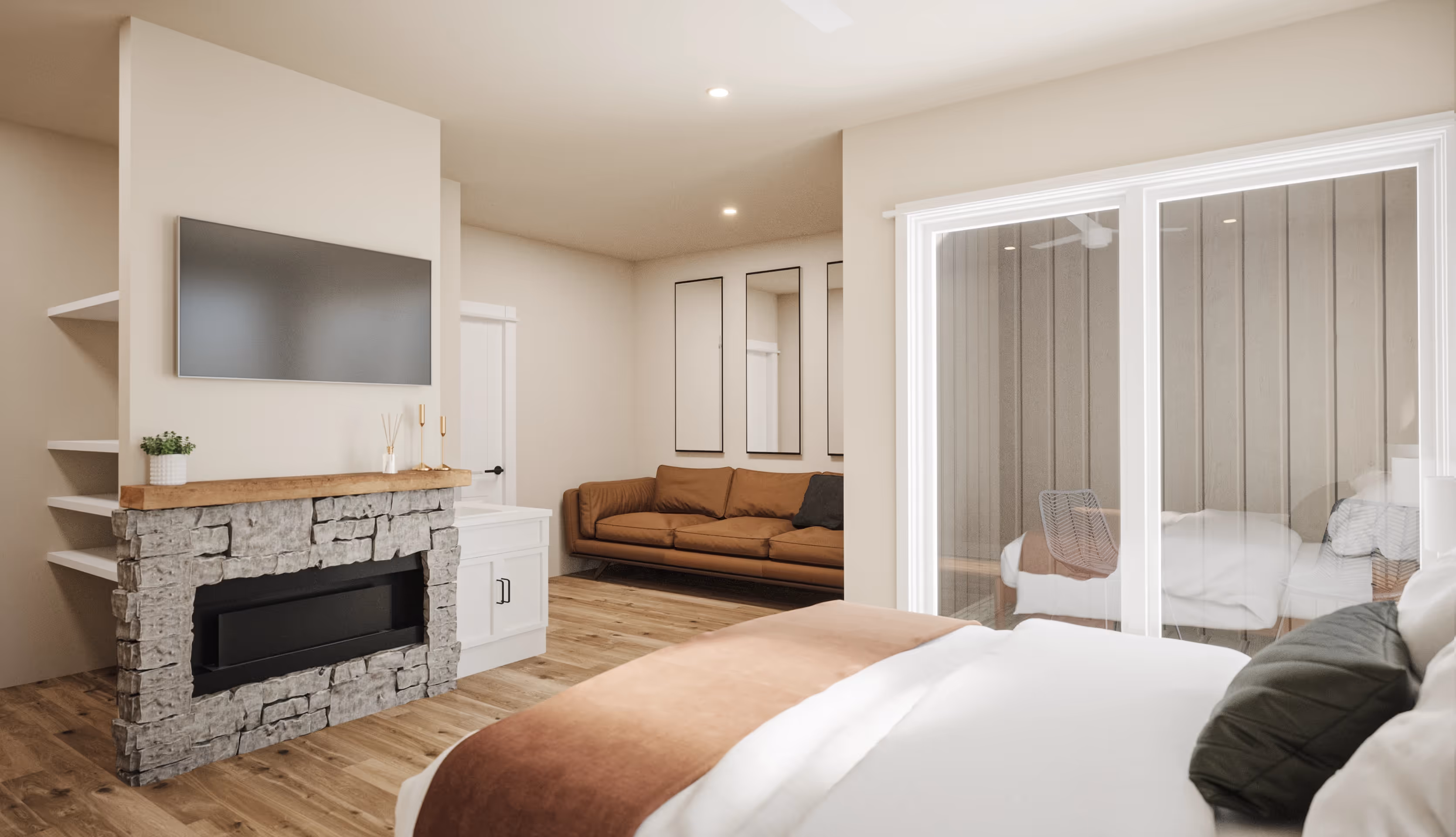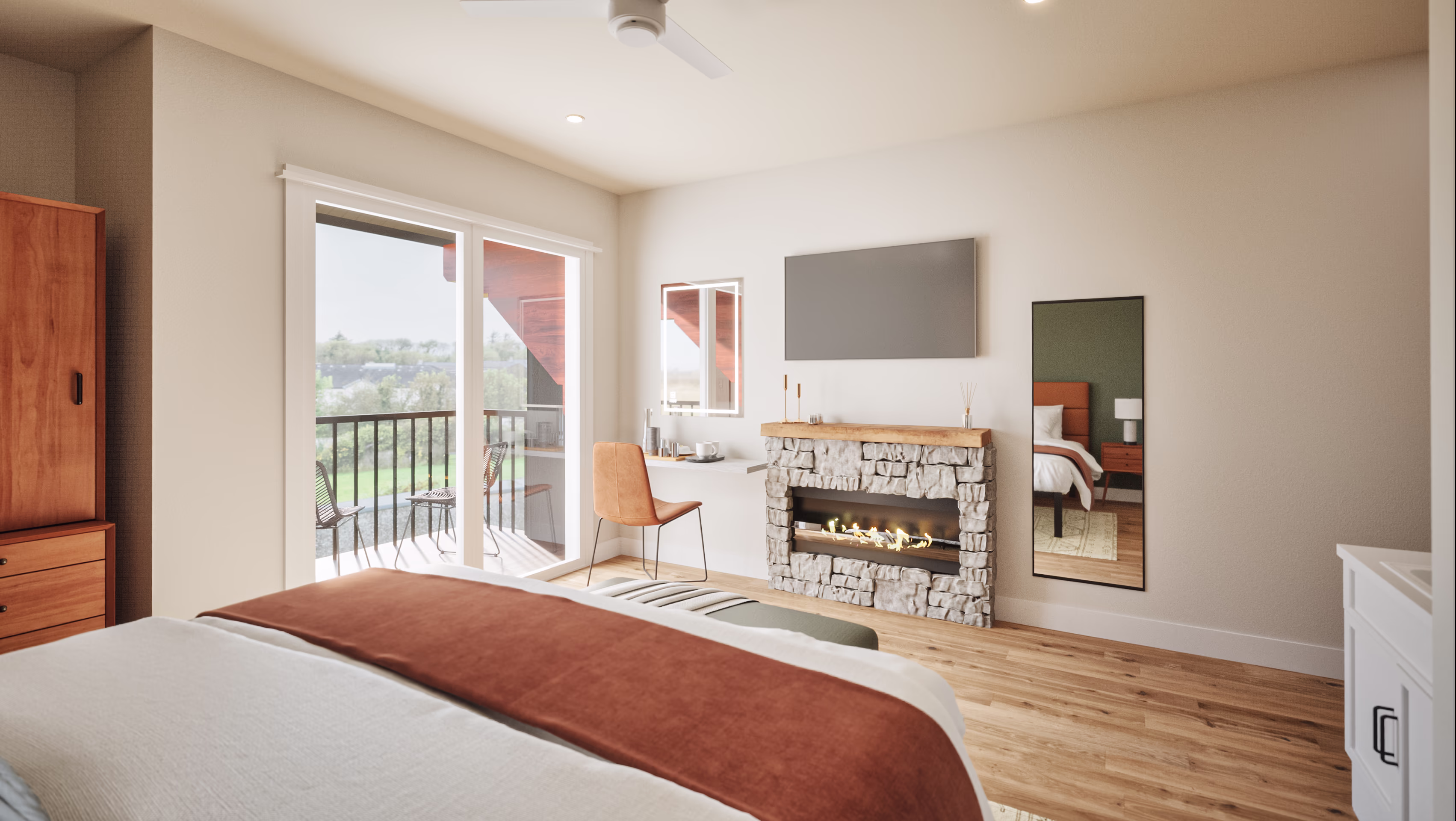 This suite has first floor convinience and includes a plush custom king-size Kingsdown mattress, tufted leather headboard, and handpicked, handcrafted furnishings. Enjoy a private balcony, stone fireplace, wet bar, beverage fridge, and custom-lit vanity, while the elegant bathroom offers a tiled walk-in shower, private water closet, and luxury Brizo fixtures.