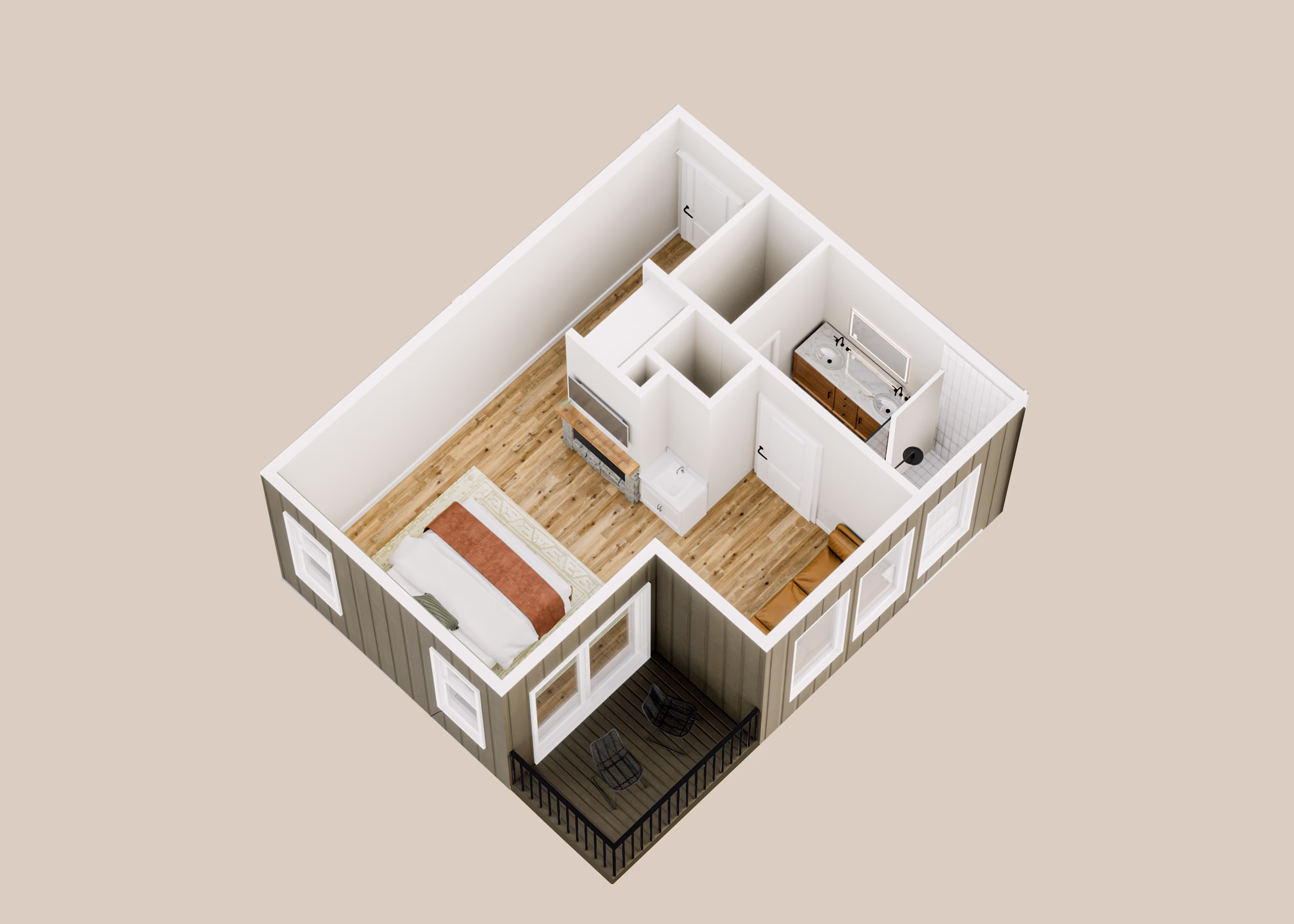 This suite includes a custom king-size Kingsdown mattress with a tufted leather headboard, complemented by handpicked, handcrafted furnishings. Enjoy added touches like a private balcony, in room wet bar, beverage fridge, and custom-lit vanity designed to elevate your stay. The spa-inspired bathroom features a tiled walk-in shower, private water closet, and premium Brizo fixtures.